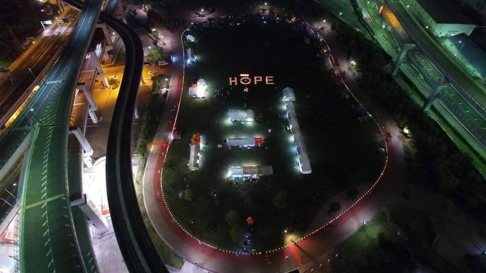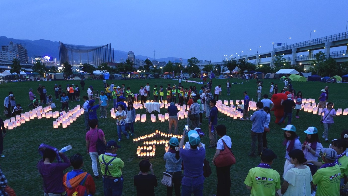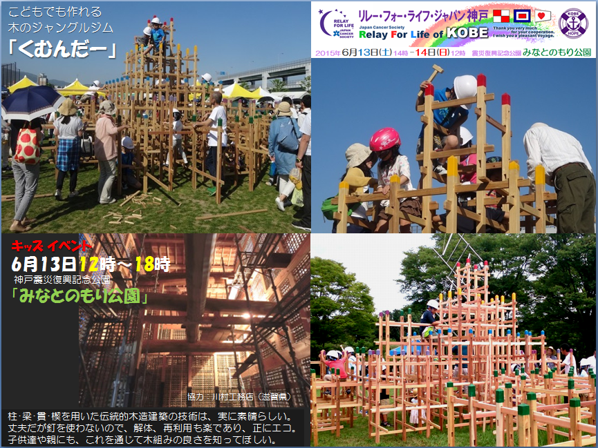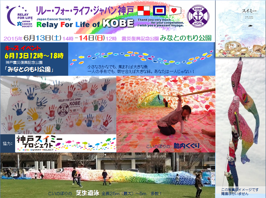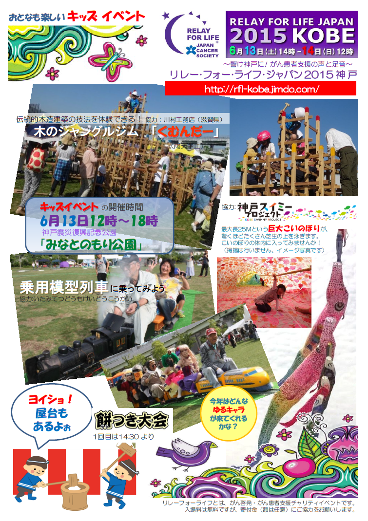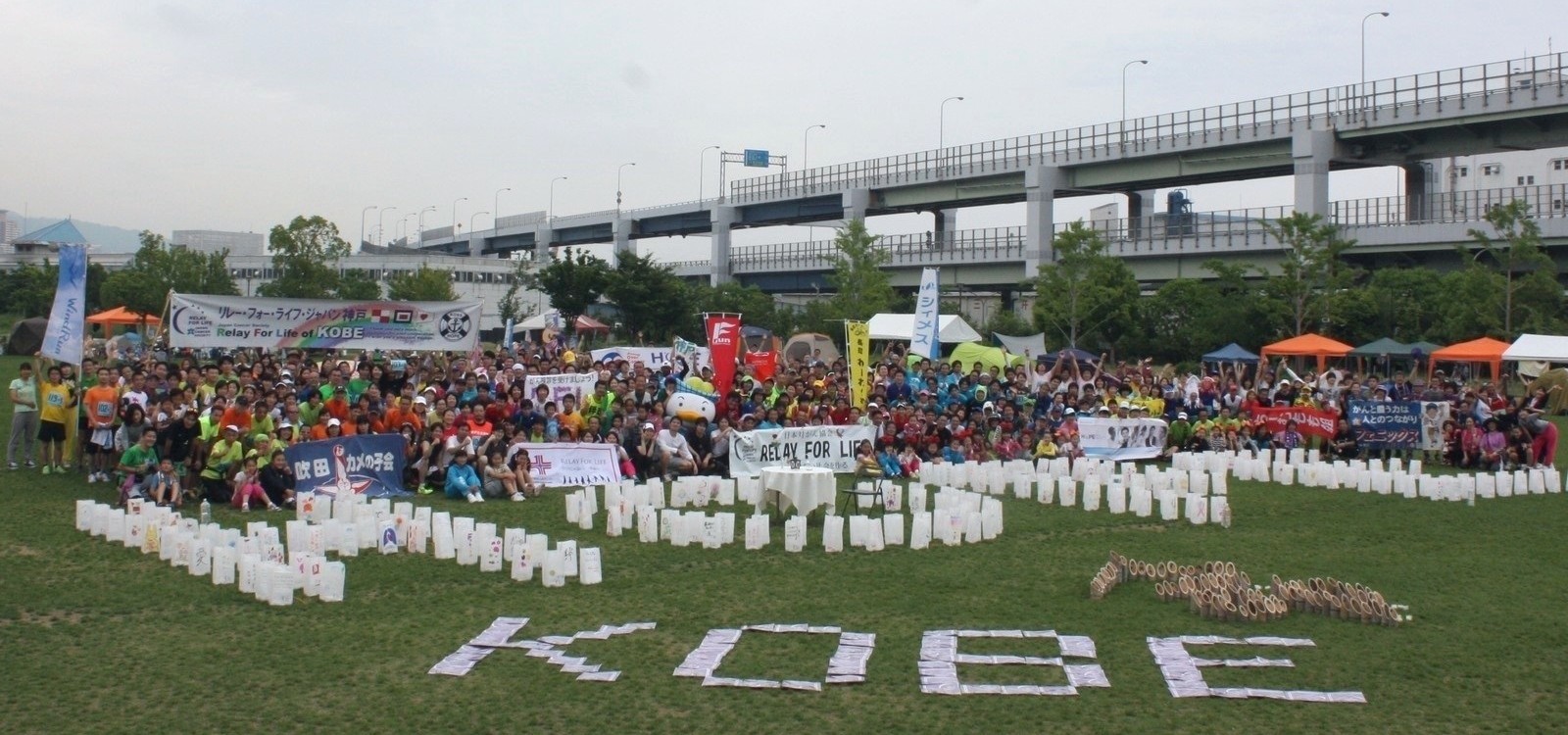 梅雨の季節にも関わらず、好天という素晴らしい贈り物を天からいただき「リレー・フォー・ライフ・ジャパン2015神戸」を、盛大かつ成功裏に終えることができました。 2回目となる今年は、阪神淡路大震災から20年という節目の年でもありました。 「震災」と向き合い、それを乗り越えてきた神戸の街と、日々「がん」と接するサバイバーに共通するのは、やはり "命をつなぐ "ということではないでしょうか。 東遊園地で燃え続ける1.17希望の灯りの前で分灯式を行い、その火をみなとのもり公園に持ち帰り、命あることを尊ぶ「鐘」の音を聞きながら、 紙燈籠の「HOPE」と竹燈籠の「命」を、皆さんの手で、一つずつ灯していただきました。 がんサバイバーと地域社会との繋がりを広げるには、子供の力を借りるのが一番です。 子供達で組み立てる「木のジャングルジム」や巨大鯉のぼり(スイミー)の胎内潜り、親子で乗れるミニ機関車、おもちつきや絵本の読み聞かせなど、 準備したキッズプログラムには、たくさんの子供達の笑顔がはじけていました。 ふらりと会場を訪れていただいた方にも立ち寄っていただけるよう設けた「おもてなしカフェ」では、お茶とお菓子を提供させ ていただきましたし、メモリアルテント「あじさいの部屋」では、写真や記念グッズを、紫陽花と共に飾らせていただきました。 |