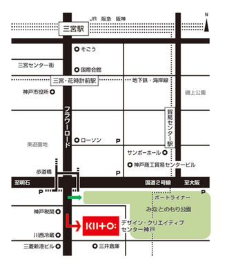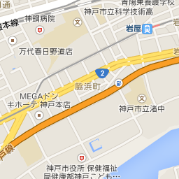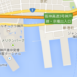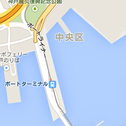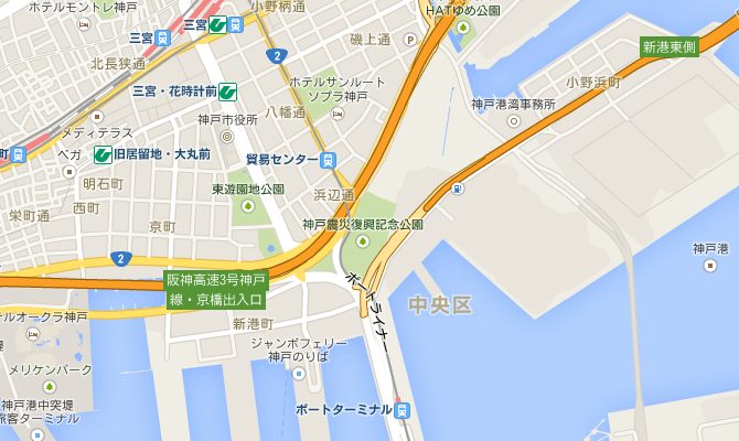 三宮の主要駅(JR、阪急、阪神)から、フラワーロードを南へ歩き、ポートアイランドへ渡る橋の手前になります。